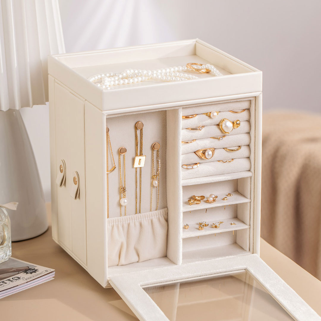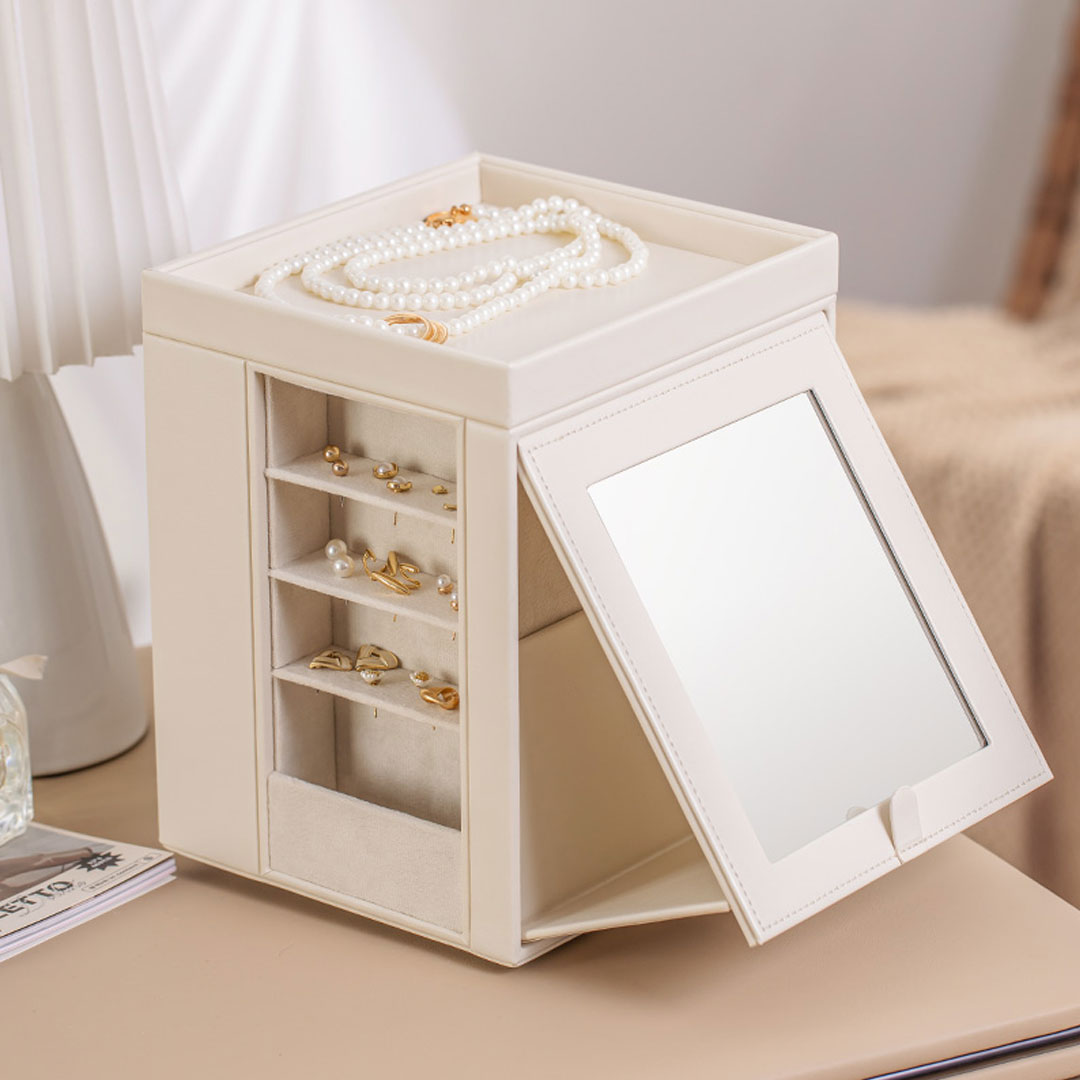 Ova rotirajuća kutija za nakit kombinuje stil i funkcionalnost. Sa četiri strane, od kojih je jedna ogledalo, pruža pregršt opcija za organizaciju ogrlica, narukvica, minđuša i drugih omiljenih komada nakita. Sa jedne strane se nalaze dvije uspravne fioke koje se mogu izvlačiti, a na vrhu kutije se također nalazi prostor koji se može koristiti za komade nakita koje nosite svakodnevno.