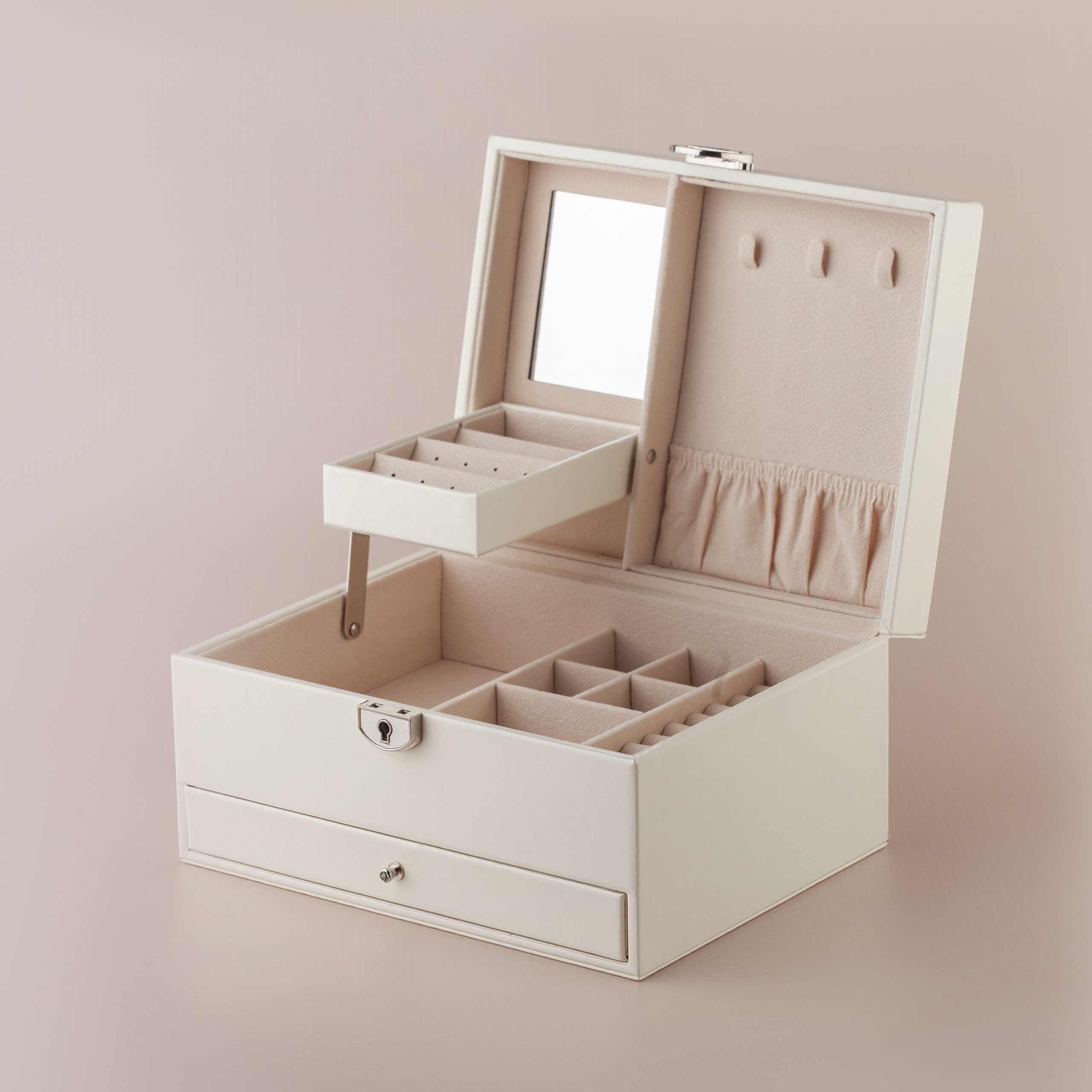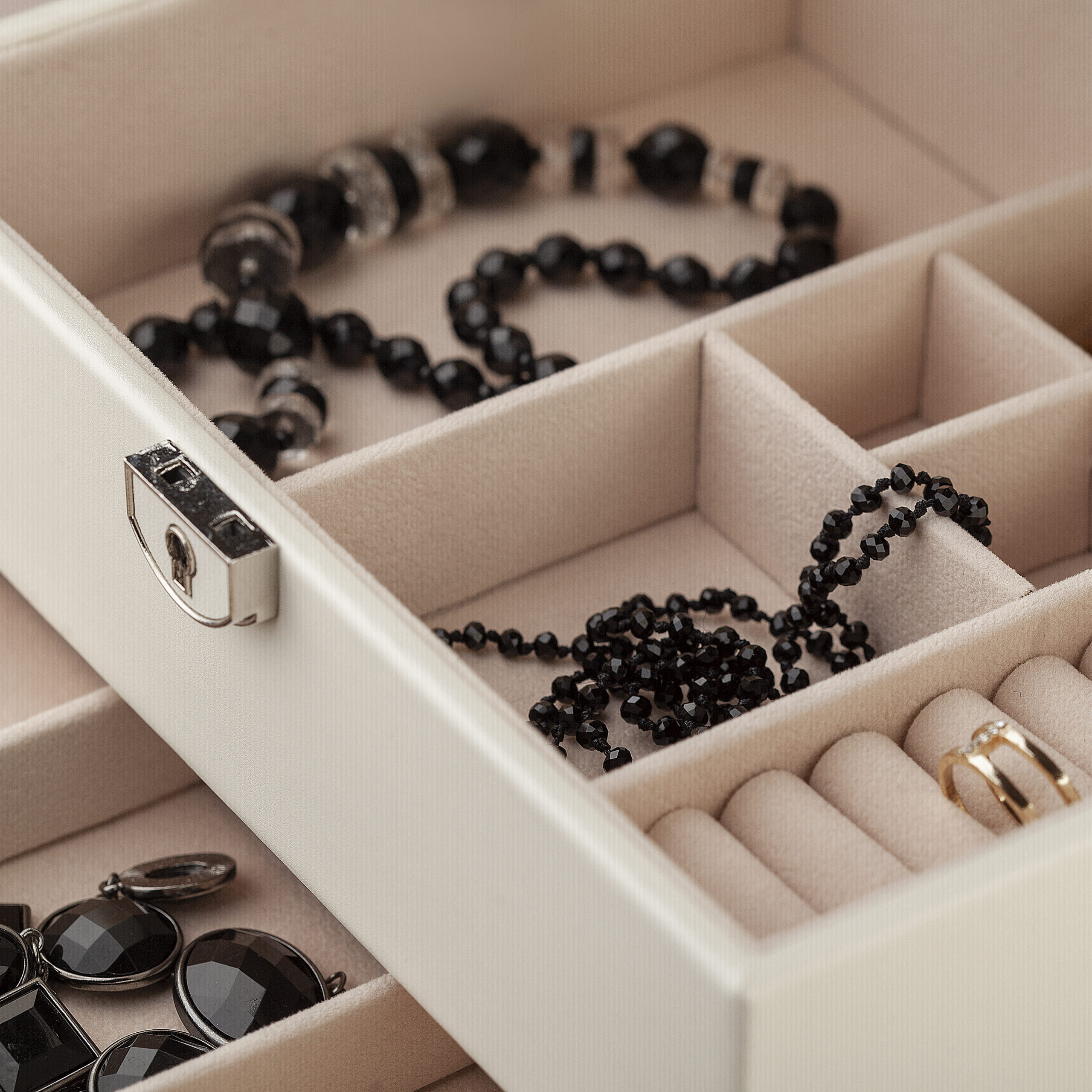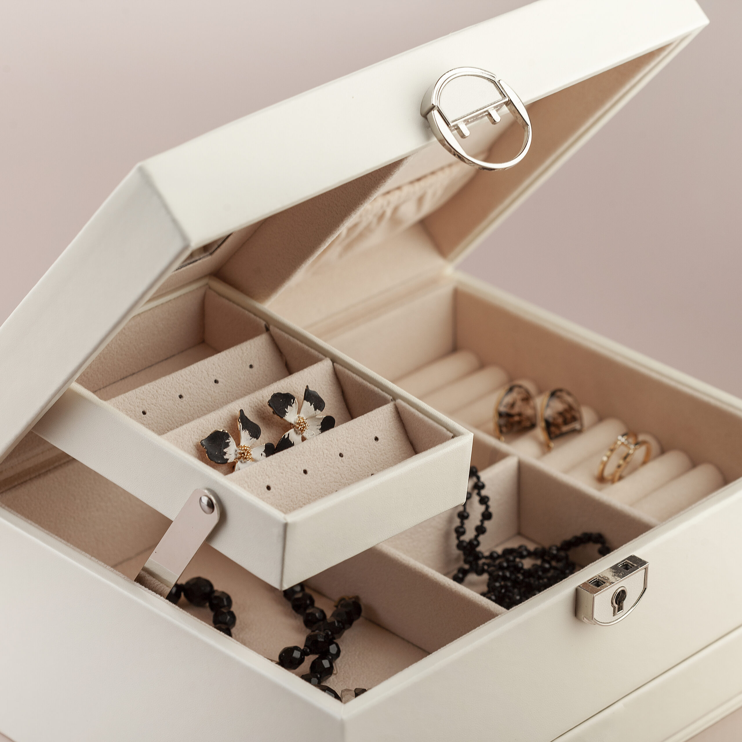 Sa donje strane poklopca nalaze se ogledalo, mali okvir za manžetne i minđuše na šraf, tri kukice za kačenje ogrlica ili narukvica i jedan džep. Pregrade u donjem djelu kutije su brojne, pogodne za odlaganje sitnog i krupnog nakita. U fioci se nalazi šest četvorougaonih pregrada, u koje se mogu odložiti satovi. Unutrašnjost kutije za nakit obložena je finim materijalom nježne boje, koji sprečava habanje sadržaja. Kutija je dostupna u dve boje- bjeloj i crnoj.