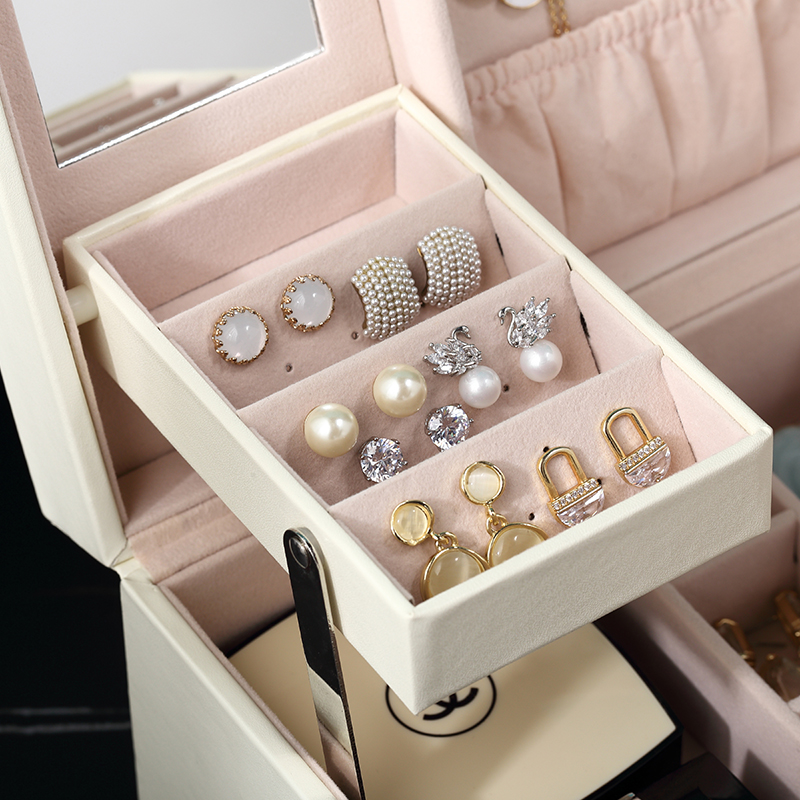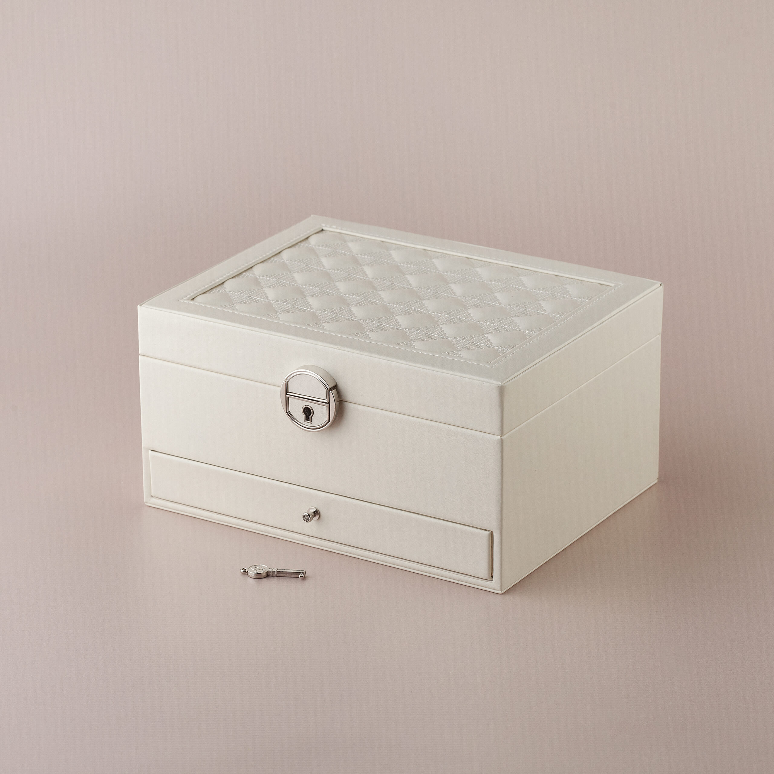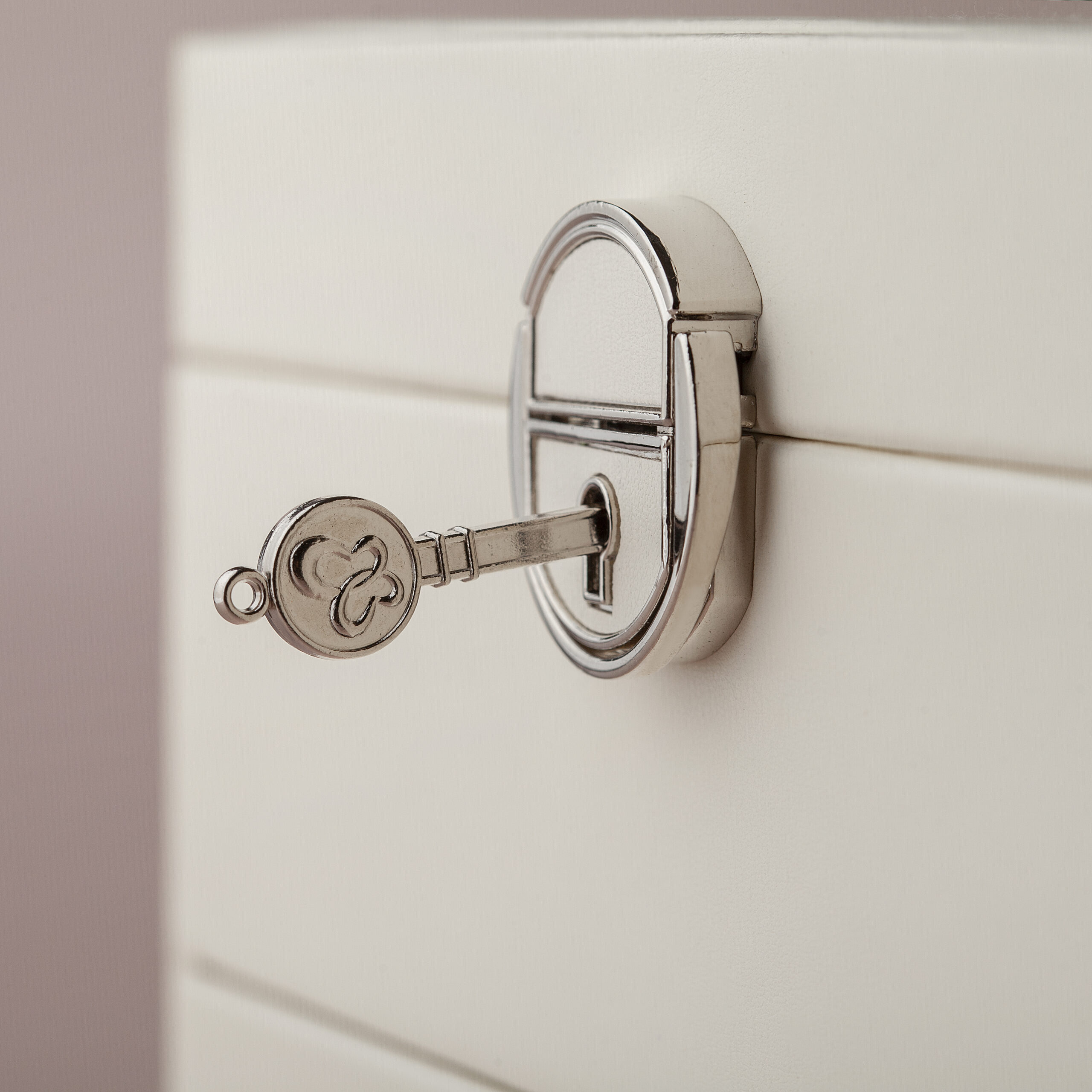 Sa donje strane poklopca nalaze se ogledalo, mali okvir za manžetne i minđuše na šraf, tri kukice za kačenje ogrlica ili narukvica i jedan džep. Pregrade u donjem djelu kutije su brojne, pogodne za odlaganje sitnog i krupnog nakita. U fioci se nalazi šest četvorougaonih pregrada, u koje se mogu odložiti satovi. Unutrašnjost kutije za nakit obložena je finim materijalom nježne boje, koji sprečava habanje sadržaja. Kutija je dostupna u dve boje- bjeloj i crnoj.