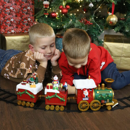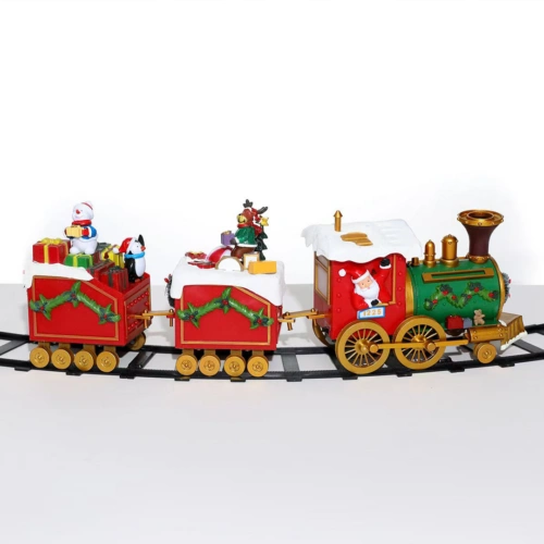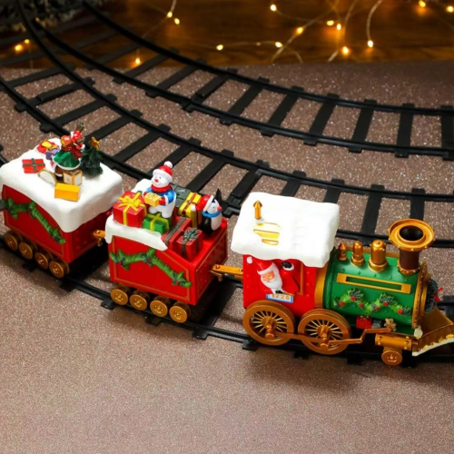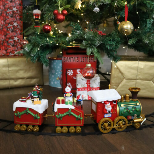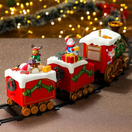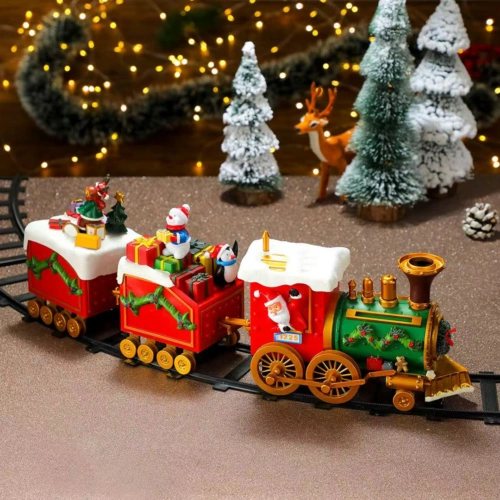 Novogodišnja dekoracija — “Voz sa šinama” je šarmantan, svjetleći voz sa dva vagona i kružnim šinama, koji se kreće i svira prazničnu melodiju. Idealna je kao glavni ukras ispod jelke — unosi radost, pokret i veselu atmosferu u dom za vrijeme praznika.
